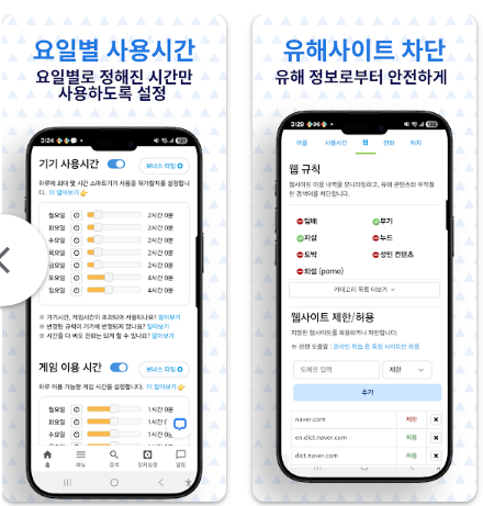 앱 차단 메뉴에서는 특정 앱을 선택하여 실행을 제한할 수 있으며, 시간 설정 메뉴에서는 하루 사용 시간을 지정할 수 있습니다.